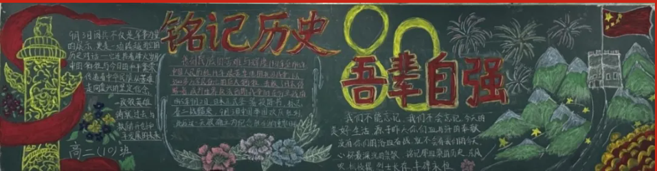 各班级围绕 “铭记历史 吾辈自强” 主题,精心策划制作了主题黑板报。同学们用粉笔绘制出壮丽的历史画卷,书写下激昂的青春誓言。一幅幅作品不仅展现了对抗战历史的深刻理解,更表达了新时代青年传承红色基因、肩负复兴大任的坚定决心。