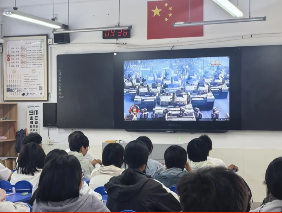 学校组织师生集中观看了“纪念中国人民抗日战争暨世界反法西斯战争胜利80周年大会” 直播。庄严的仪式、铿锵的讲话、厚重的历史回顾、盛大的阅兵场面,让在场每一位师生都深受震撼和教育。大家凝神观看,不时报以热烈掌声,民族自豪感和爱国热情在会场澎湃涌动。